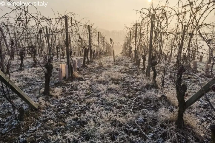Davanti a noi, il tocco artistico dell’Inverno, che ricopre di brina i rami degli alberi e i tralci delle viti spoglie, che dormono abbracciate dalle coltri di nebbia e aspetto il nuovo inizio e l’imminente potatura.