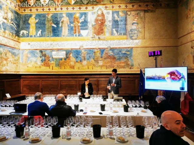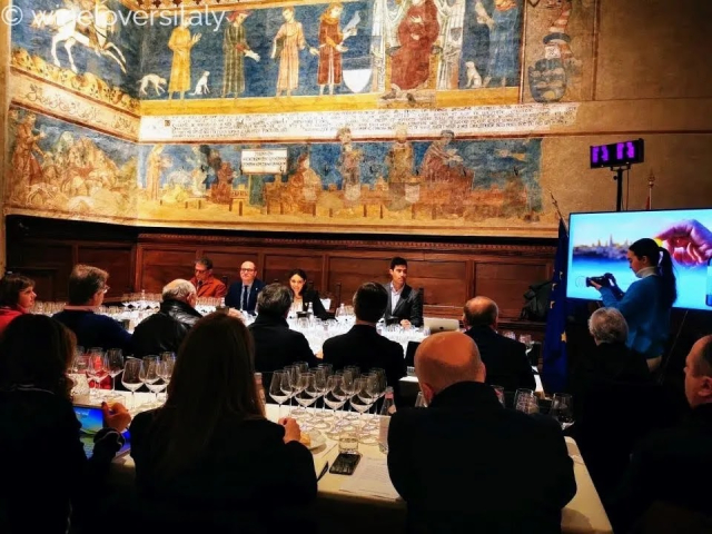 In sala Dante, davanti a rappresentanti della stampa italiana e internazionale, è iniziato un viaggio nel tempo: il primo vino in degustazione è stato il Campo della Pieve 2019 del Colombaio di Santa Chiara. Aperto 2 ore prima della degustazione ha colpito per le note floreali, di frutta tropicale (mango) e per i sentori affumicati. Grande integrazione tra le varie componenti e sicuramente una bella proiezione in divenire.