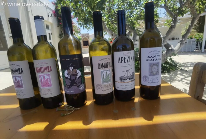 PGI Cyclades Fabrika White ottenuto da malvasia coltivata a Syros (20%) e il resto a Paros, e da un 15% di Kountoura, altro nome del savatiano.