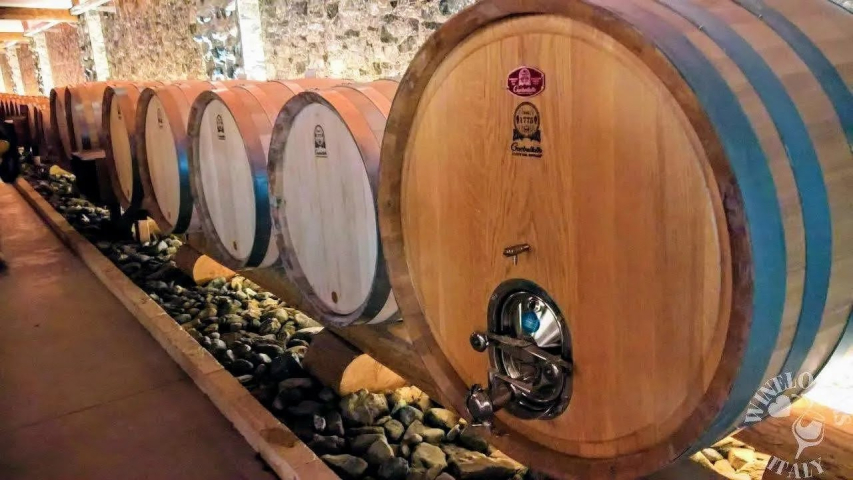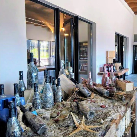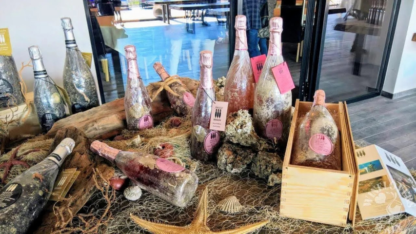Nella cantina alloggiano le pupitres per il Metodo classico che viene affinato in mare, anche nella versione rosè.