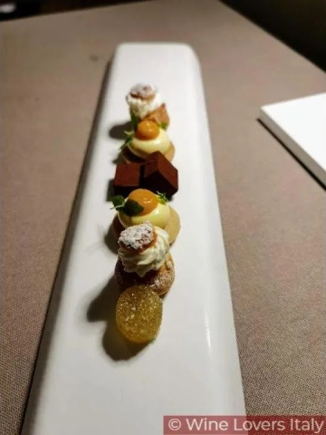 acciuga di Monterosso ripiena con pesto e ricotta accompagnata da un gel di limone salato e chinotto di Savona, tartelletta di farina bruciata con bavarese al blu di Moncenisio con composta di pomodoro cuore di bue, palamita tonnata, macaron ripieno con mousse di mortadella e i cioccolatini di fegatini di coniglio variazione di nocciole misto Chiavari e cioccolato al 72%, in una parola fantastico…