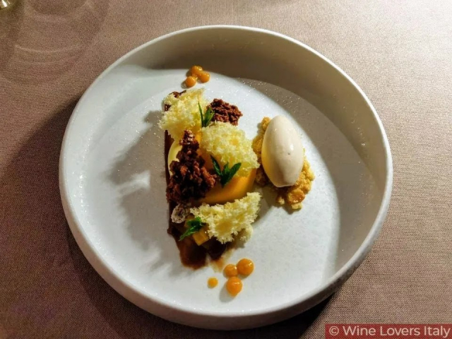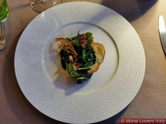 Il vino è abbastanza morbido con una vena tannica dovuta alla macerazione che rinforza la sapidità anche in questo caso un ottimo abbinamento poichè il piatto è articolato su diverse sfumature di gusto dove abbiamo l’asparago con la nota verde, il dolce della cipolla, la consistenza del baccalà che sembra opporsi alla masticazione ma poi cede in bocca, un’esperienza sensoriale meravigliosa e abbinamento ancora una volta armonico.