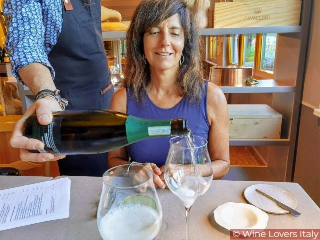 Il primo piatto è cappelletto 32 rossi ripieno di patate di montagna, fricassea di ortaggi, emulsione di rucola e melissa consommè alla parmigiana che viene accompagnato da un calice di Vetua 2018 dell’azienda di Sebastiano Catania in Monterosso, il blend comprende oltre ai tre viigni classici delle Cinque Terre bosco, albarola e vermentino anche tre vecchi vitigni autoctoni recuperati: piccabun, frappelà e brujapagià.