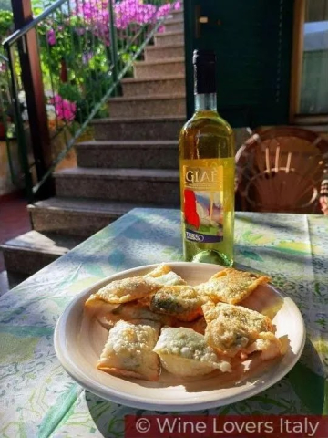 La nostra chiacchierata prosegue a casa della signora Renata, sua mamma, che mi ha preparato i Gattafin (frittella ripiene di erbette di Levanto) seguendo fedelmente l’antica ricetta -davvero ottimi- che accompagnano la degustazione dei vini bianchi.